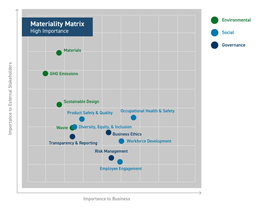 In 2022, we commissioned a materiality assessment to identify high-priority sustainability issues requiring immediate and focused attention. The material issues identified as high importance were: Materials, Greenhouse Gas Emissions, Sustainable Design, Occupational Health and Safety, Employee Engagement, Product Safety and Quality, Diversity, Equity and Inclusion, Business Ethics, Risk Management, and?Transparency and Reporting.