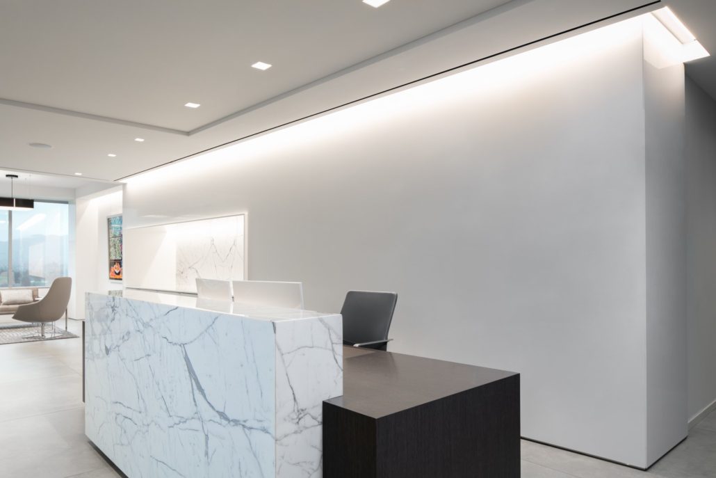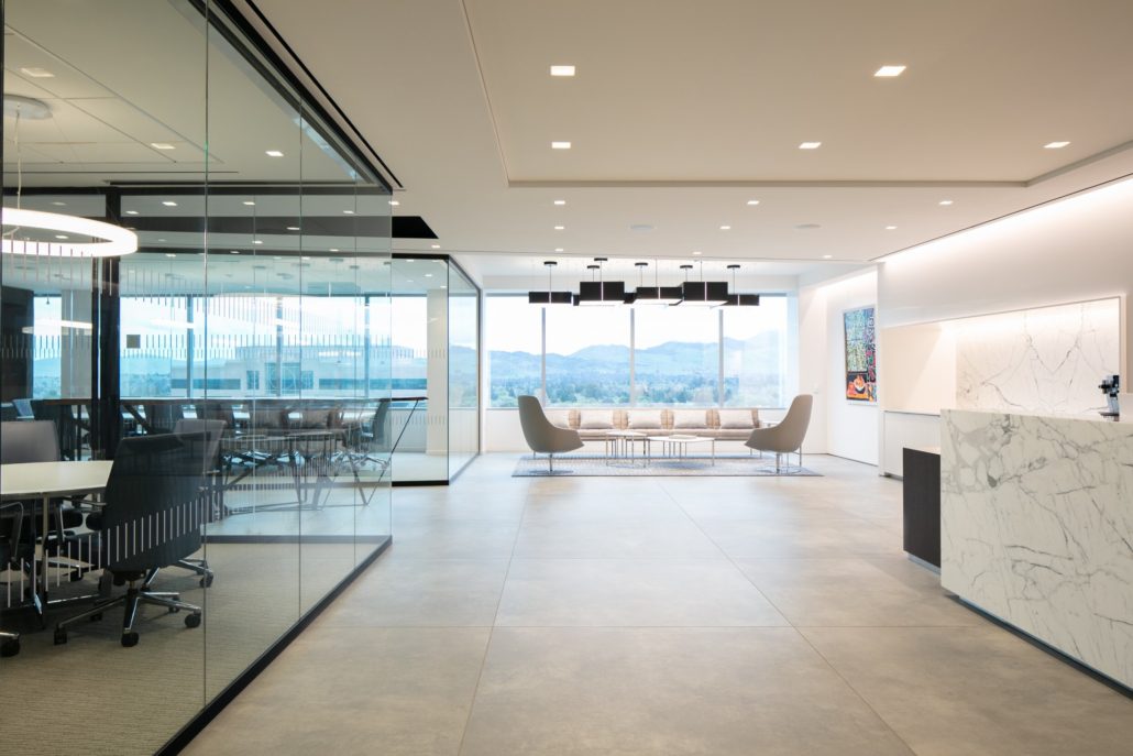 Swinerton completed the tenant improvement of UBS’s 24,000-square-foot Wealth Management office on the 7th and 10th floor. The improvement consisted of demolition of the existing spaces back to the structure, followed by a build-out of open-office space, offices, conference rooms, and equipment rooms. Amenity spaces include pantries with banquettes, coffee bars, a mailroom, and a powder room. Numerous high-end finishes are used throughout the space including wood veneer walls, solid surface wall panels with CNC logos, fabric wall panels and ceiling, glass partitions throughout, and large format 5’x5’ custom floor tile.