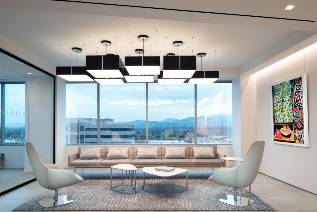 Brought on board early as a partner as the CM/GC for preconstruction services, the team established the budget through several rounds of value engineering and the schedule commenced for demolition. Swinerton self-performed the demolition and led the coordination of MEPF design-build trades. The tenant build-out included casework in break room and gathering areas; walnut slab island millwork in the cafe eating area; a reception desk with wood feature walls; wall finishes; dropped ceiling tile and hardlid ceilings; a Hufcor demountable wall system; and specialty fixtures—pendant and “antler-concept” suspended linear light fixtures.