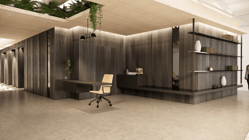 The new Campbell Global office space sits on the 32nd?floor in the Wells Fargo Tower. Campbell Global, a timber investment company, wanted to showcase multiple wood elements throughout the office to highlight their business. GBD Architects captured this idea in a beautiful design, creating a unique and high end space for Campbell Global. The main wood elements featured within the project are the CLT panel ceiling clouds, furnished and installed by Swinerton Mass Timber. Mass Timber played an integral role by bringing their knowledge & expertise of CLT to the unique feature element. The Swinerton self-perform Drywall team was also a key contributor. Collaboration between the management and drywall teams early on resolved a majority of the site questions & layout issues resulting in increased efficiencies and smooth project flow.