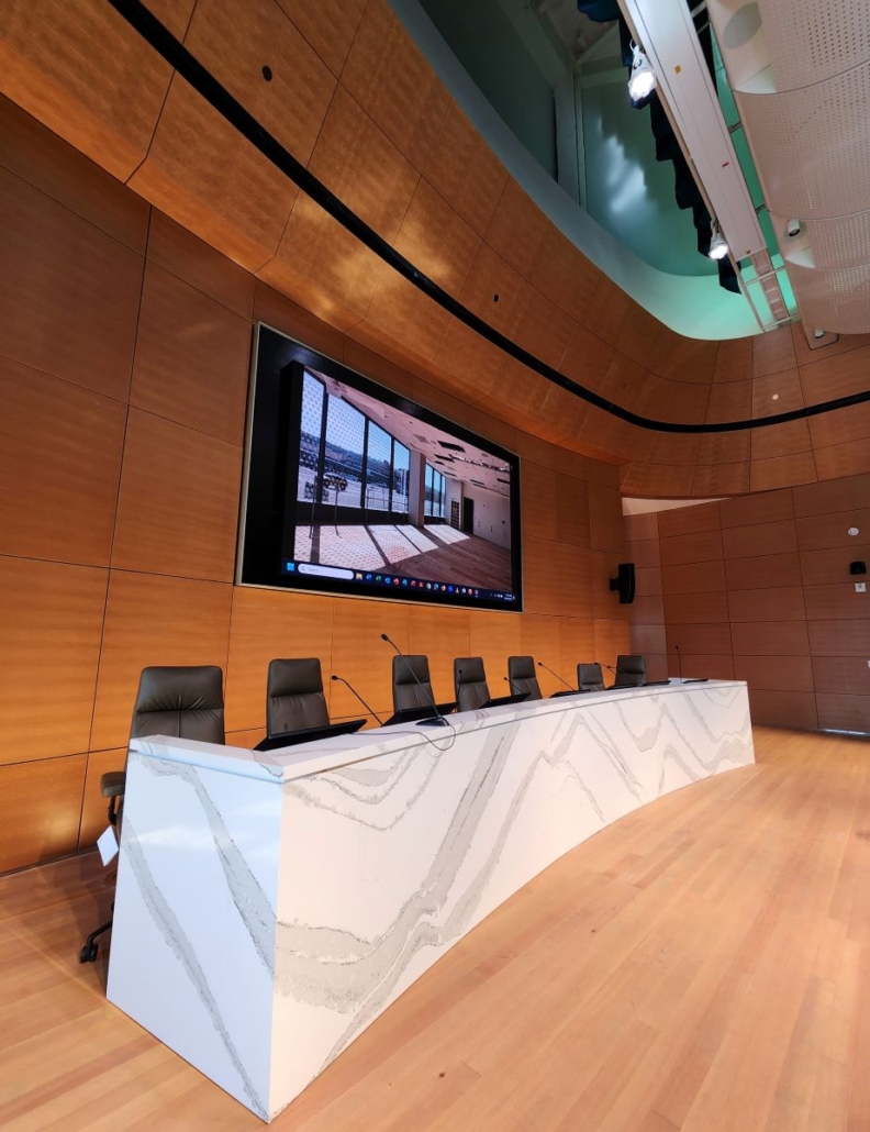 The 5,000-square-foot community theater serves as a performance area and space for the City Council chambers to hold community meetings. The 35,000-square-foot parks and recreation center houses small, medium, and large classrooms, music rooms, and exercise/dance spaces, along with 1.3 acres of developed parkland. The large hub provides a central welcome space for the entire facility, including areas for small lectures, receptions, and galleries.