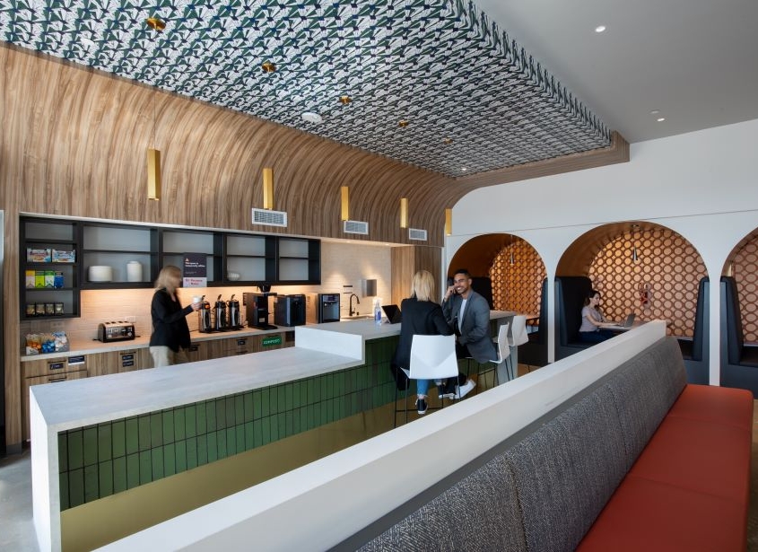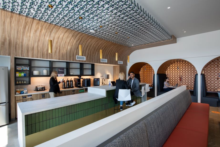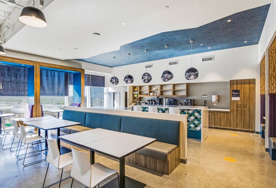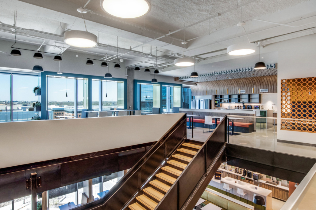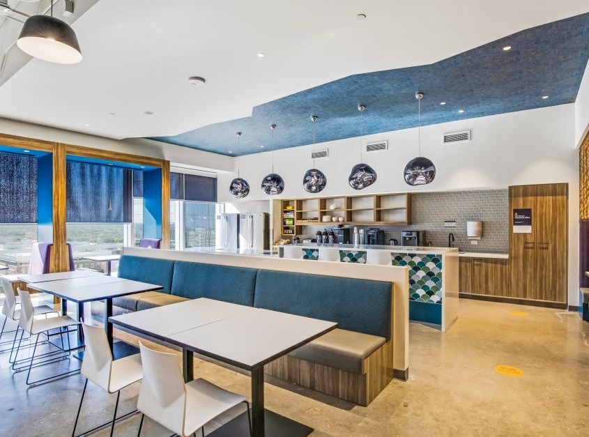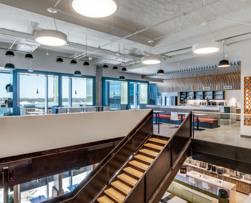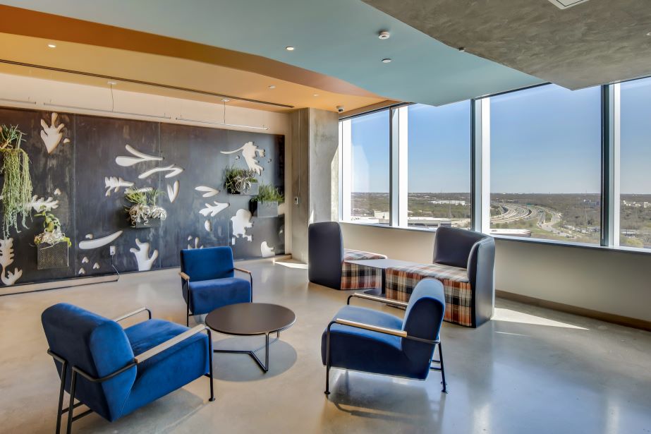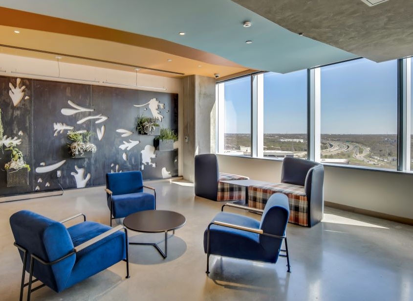 The Domain 10 tower is a 15-story class A podium-style office building with 299,673 square feet of rentable office space. Within this building, Swinerton built out 240,805 square feet over seven floors for a technology client. Included in this scope is an insulated lab and a 27,000-pound heat exchanger on the roof for the labs, IDF and MDF server rooms. Inspired by west Texas landscape and western charm, the architect designed the new office to include open workspaces, training rooms, breakrooms, as well as various conference and huddle rooms. As home to more than 2,000 employees, supporting spaces include a full-service kitchen with dining space, kitchenettes on every floor, interconnecting staircases between floors, and a roof deck with outdoor seating.