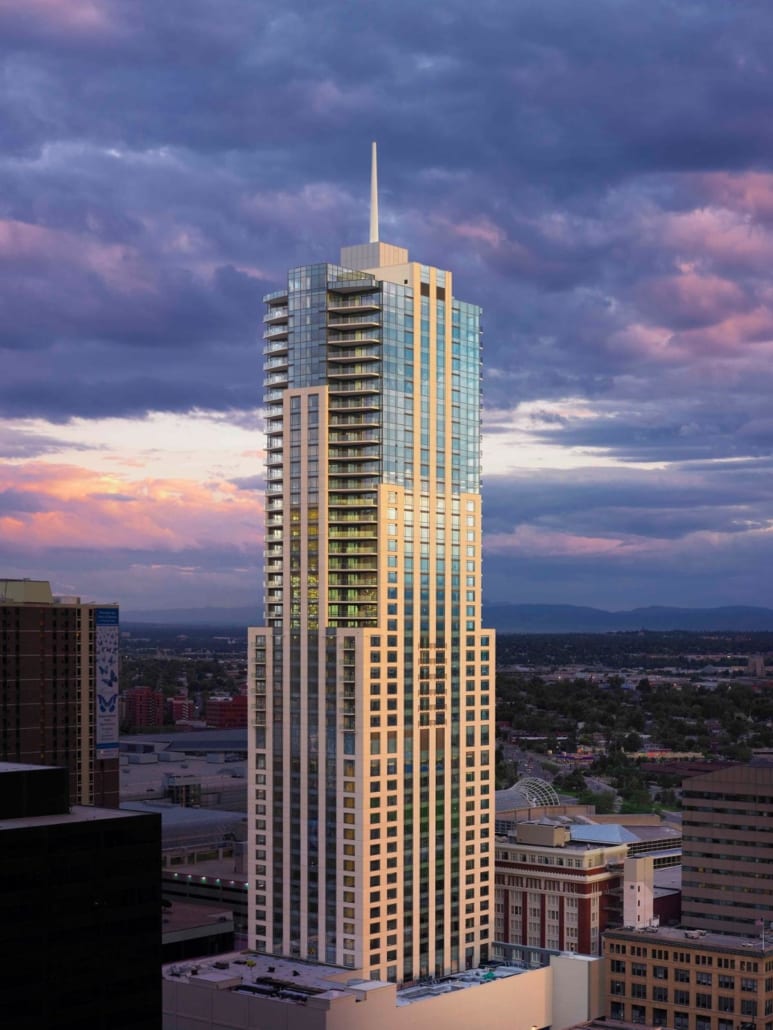 The Four Seasons Hotel and Private Residences quickly established itself as a landmark in the downtown Denver skyline.?The cast-in-place, post-tensioned concrete structure rises at the corner of 14th Street and Arapahoe to 45 stories.?Sitting upon a two-level underground parking structure, the lower 16 floors encompass 239 guest rooms, hotel lobby, signature restaurant, bar and lounge areas, meeting space and ballrooms served by a banquet kitchen, a fitness center, and full-service spa with an outdoor pool.?Atop the hotel from floors 17 through 45 are 102 luxury condominiums ranging from one to four bedrooms with balconies that offer unparalleled views of Denver and the mountains beyond.?Crowning the building is a 76-foot tall mast that stretches into the Colorado cobalt skies, and serves as a point of distinction within the theater district setting.