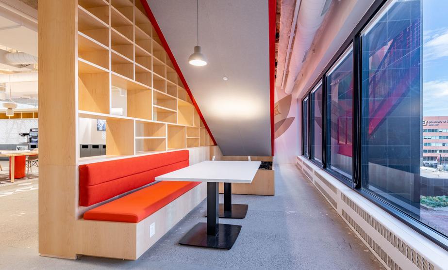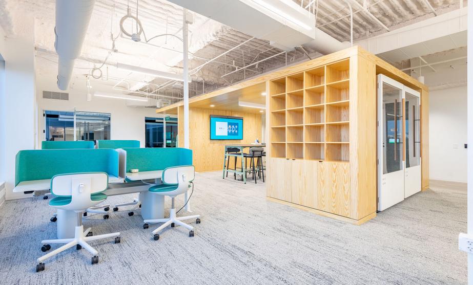 A 34,000-square-foot office build-out with Gensler that includes an interstitial stair connecting the level 6 office to level 5, with conference and huddle rooms, open office design, new restrooms, kitchens, millwork and collab booths. The scope of work included the demolition of the existing space, new carpet, and tile, polished concrete with epoxy graphics, architectural millwork features, wall murals, a holographic sign, acoustical wall panels (stretched fabric), overhead coiling door, and custom writeable walls.