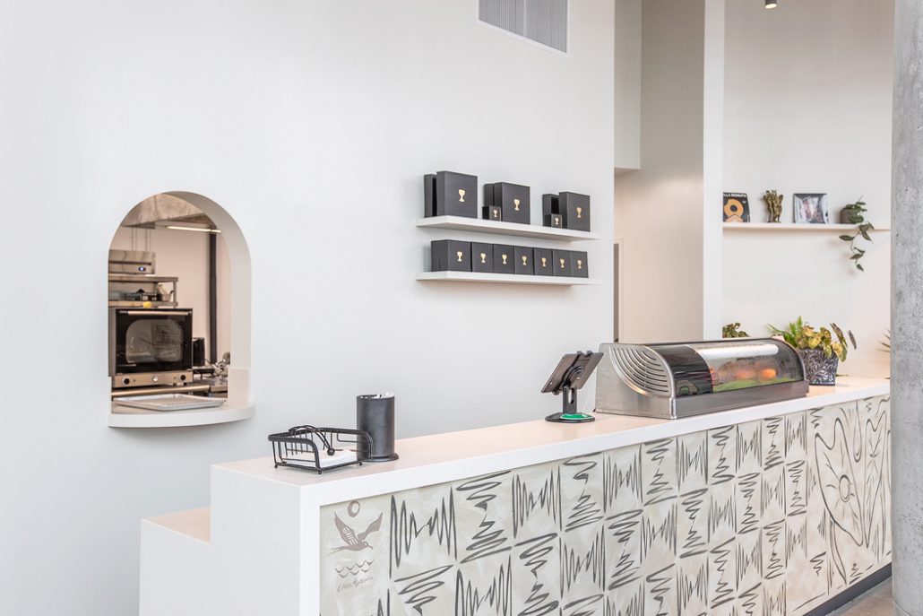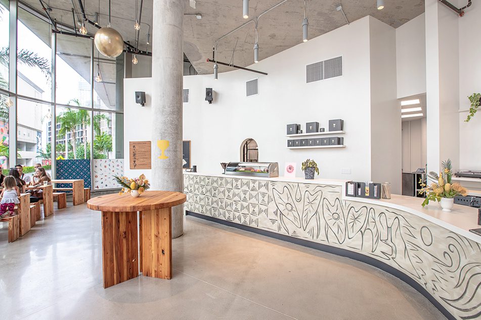 Core and Shell, Kitchen, service bar, dining area, Vinyl flooring, glass display counters, Wood paneling, cabinetry, casework, Lighting, paint, D/F/H, finishes, MEP