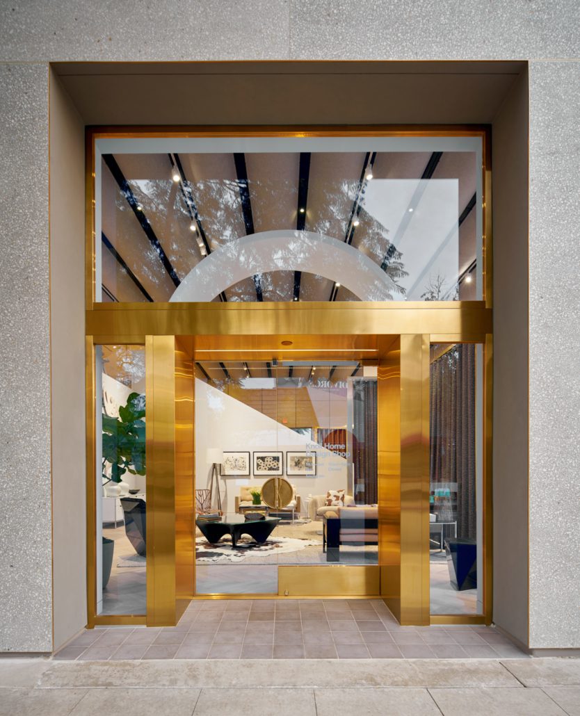 After a complete interior demolition, a full buildout transformed the 5,000-square-foot, two-level space into an extremely high-end retail store. The existing stair was removed and replaced with a new architectural stair and new skylights were added. High-end interiors and fixtures include golden-toned mirrors within brass trims on all walls; new herringbone oak wood flooring; and a display arch constructed with tube steel. An innovative modulated system of draped felt panels defines the ceiling, while free-standing archways stand behind the glazed frontage.