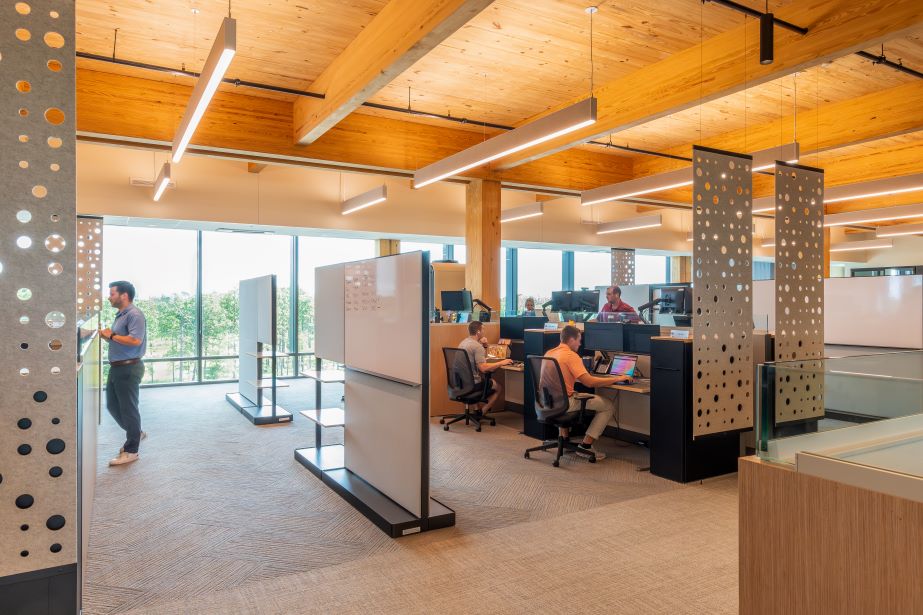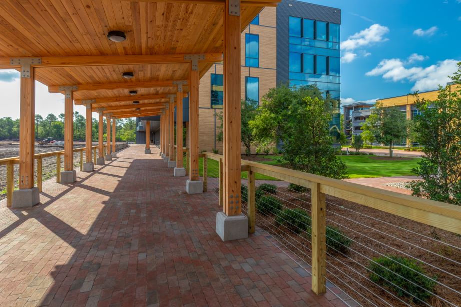 The first project of its kind in eastern North Carolina, Building Four is constructed with a 100% mass timber structural system under an exterior of cypress siding, metal panels and curtain walls that complement the campus’ existing serene aesthetic. Designed by the Wilmington office of LS3P, the building showcases biophilic elements such as exposed timber and natural light, as well as encourages occupant connectivity to the natural beauty of the surrounding wooded area and pond on the campus. The building is expected to achieve LEED Silver certification.