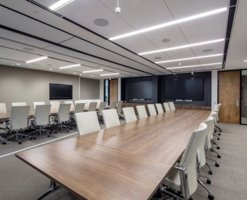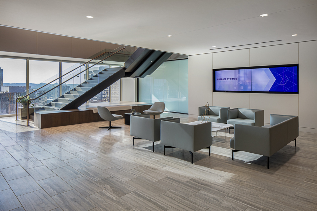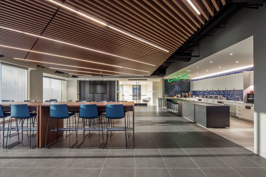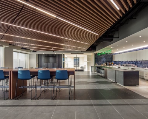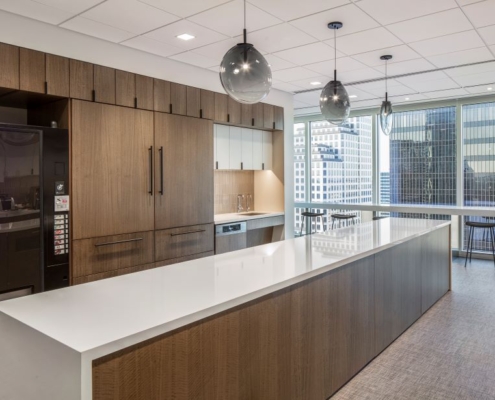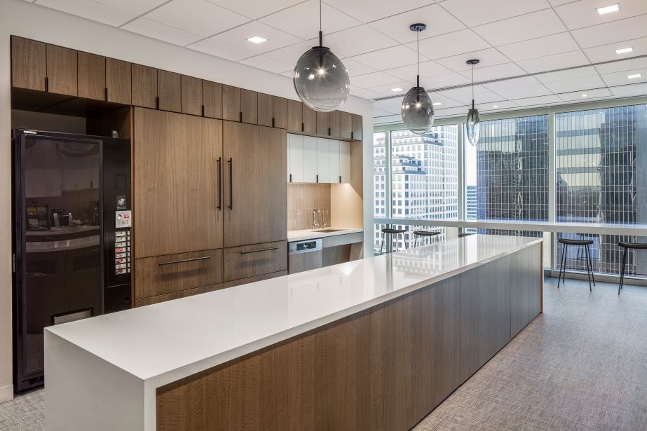 Swinerton renovated PIMCO offices on the 22nd and 23rd floors in one of Austin’s most iconic buildings. Designed by Gensler, this 47,000-square-foot project consists of open and closed offices, conference rooms, a café, and break area, and a new reception area. The space includes an interconnecting staircase along with a leather-wrapped handrail to tie in the break area to reception. One of the meeting rooms features a hidden entry door, custom-made by our millworker for that space. The breakroom incorporates a custom-designed light piece by Gensler that hangs over the island.