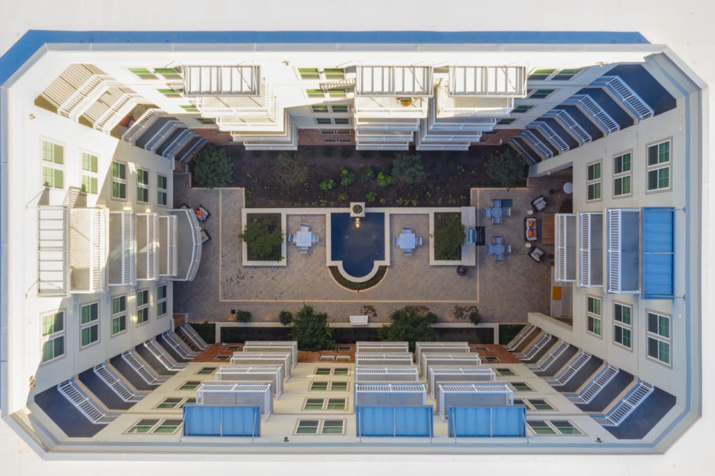 The two buildings, bisected by a city street, have a variety of exterior finishes including stucco, king brick, and cast stone over partial podium. Each building was designed to preserve the diverse character of the neighborhood. The new residential community contains 14,639 square feet of retail space and a precast parking structure with 651 parking spaces. Along with the leasing office and workroom, other amenities will include three courtyards with fountains and grilling areas, entertaining space, dog turf/walk/wash, a fitness center offering group classes to residents, and a paseo area.