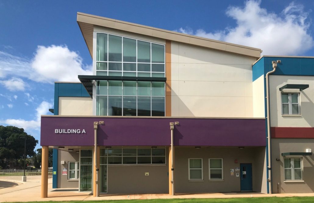 new classroom building, administration building, cafeteria building, play court and parking areas
