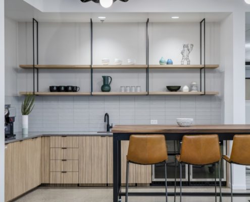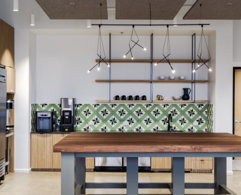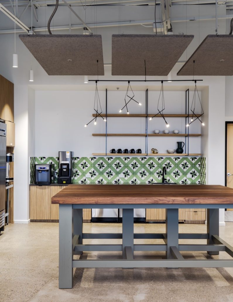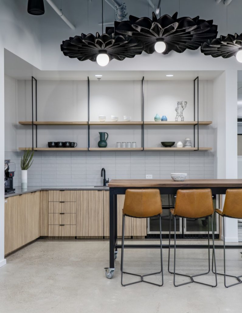Brought on board early as a partner as the CM/GC for preconstruction services, the team established the budget through several rounds of value engineering and the schedule commenced for demolition. Swinerton self-performed the demolition and led the coordination of MEPF design-build trades. The tenant build-out included casework in break room and gathering areas; walnut slab island millwork in the cafe eating area; a reception desk with wood feature walls; wall finishes; dropped ceiling tile and hardlid ceilings; a Hufcor demountable wall system; and specialty fixtures—pendant and “antler-concept” suspended linear light fixtures.