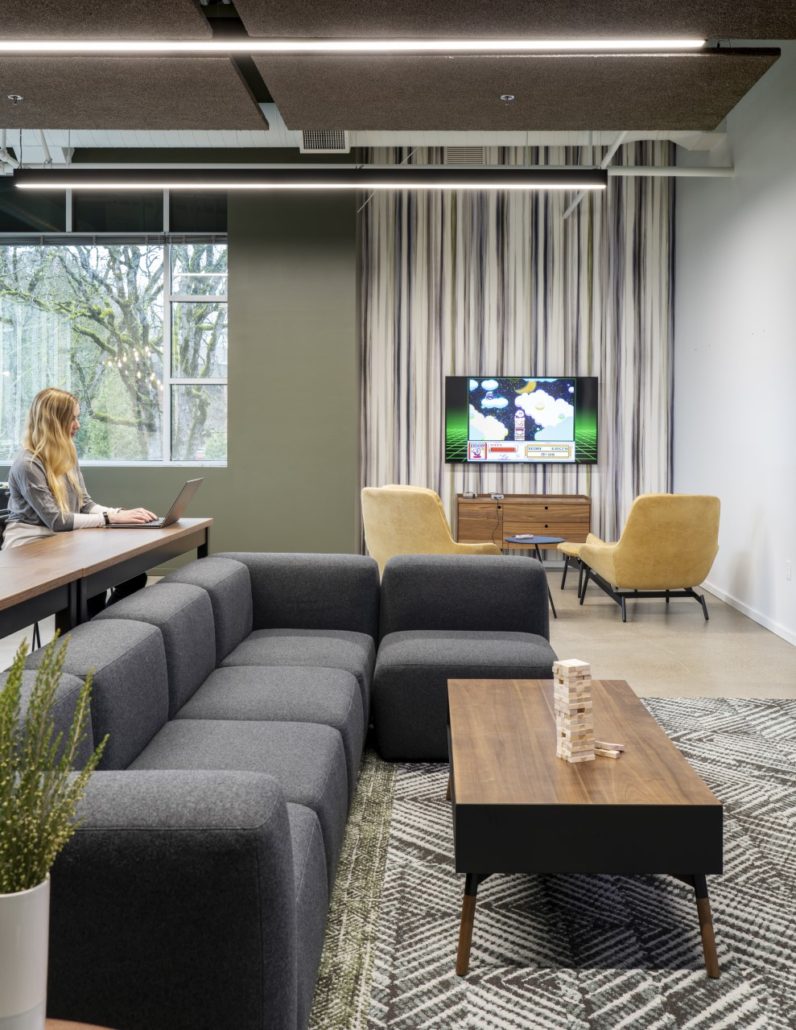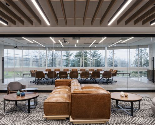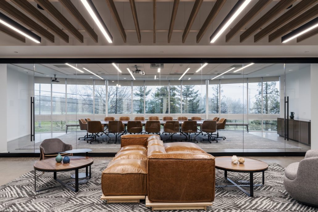 Located in Tigard, 20 minutes from downtown Portland, The Partners Group moved across the street to expand and update its 30-year-old brand to a Pacific Northwest lodge concept space. The 33,000-square-foot office encompasses two floors with open workspaces, private offices, breakout conference rooms, a game/lounge room, and a concept living room area adjacent to the board room, which can transform into a large entertaining space.