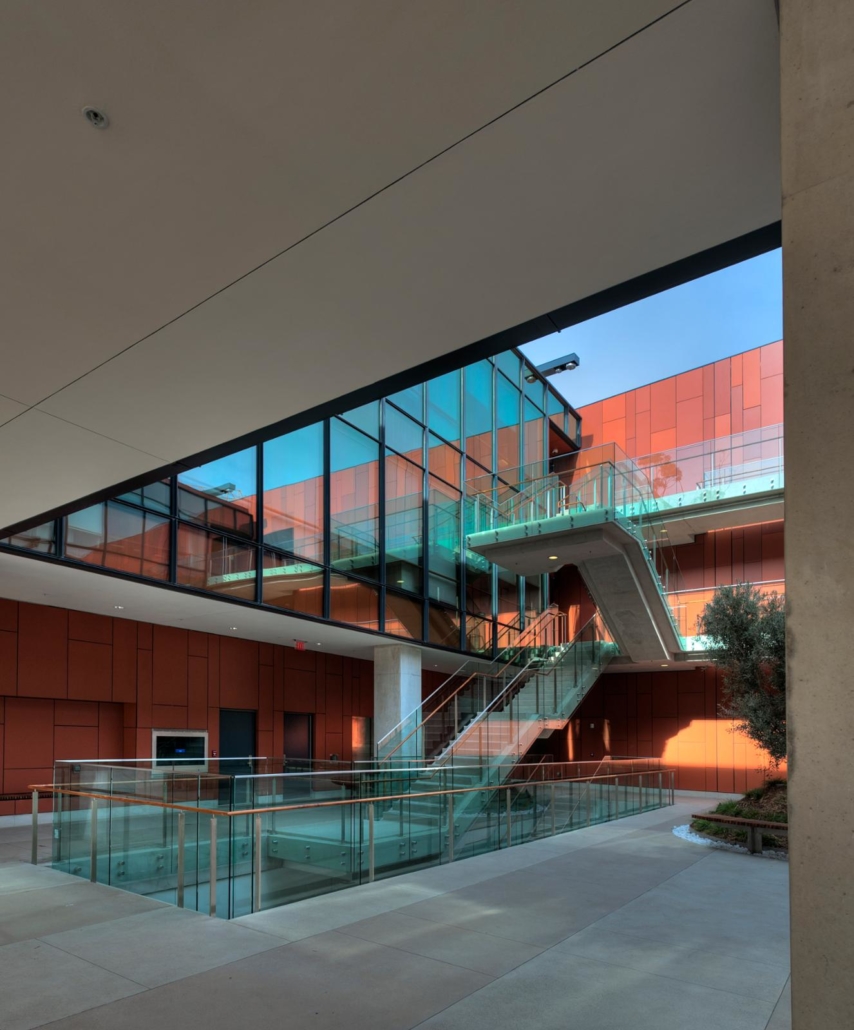 Certified LEED Gold, the 100,000-square-foot, cast-in-place concrete classroom and office building has three stories above-grade and 1 below-grade. The exterior consists of exposed cast-in-place concrete, unitized glazed aluminum curtain wall, and composite resin panels. Located on the UCSD main campus within the School of Medicine, it incorporates state-of-the-art design and technology to train medical students in the latest advances of medical and surgical technology. The Medical Education and Telemedicine Center combines and expands programs previously scattered around the La Jolla campus and at the UCSD Medical Center in Hillcrest. It includes a simulated hospital in the lower level with simulated operating rooms, exam rooms, emergency rooms, and microsurgical lab space.?The 6,800-square-foot medical and surgical procedures teaching laboratory contains 22 stations where students are instructed in the latest techniques of surgical, robotic, endoscopic, and other special techniques. It also features a 350-capacity, three story auditorium space on the ground level along with a restaurant and outdoor courtyard/gathering space for the staff/faculty and students. Upper levels include conference rooms, office space and teaching stations, all with state of the art audio visual and media services. Ground level site work incorporates high end decorative concrete and landscaping features. Project scope also includes the extension of the campus central plant utility structures (chilled water and high temp hot water lines) as well as a 12Kv electrical duct within a public street.