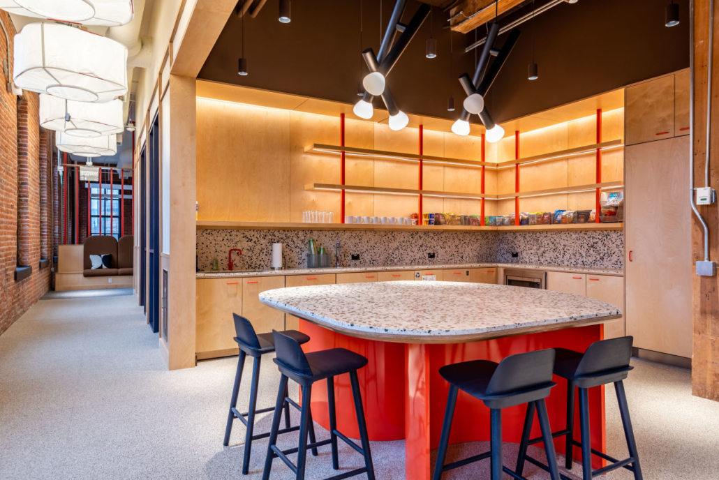Udemy brought a creative workspace that supports flexibility for all of its employees. Their new space promotes creativity, collaboration, and communication from the relaxing cushion chairs overlooking Coors Field to the agile private offices. The new office layout aligns with Udemy’s diverse and inclusive culture as it provides large conference rooms and single-person call booths, a kitchenette that offers a variety of snacks and drinks, and green plants adorn the office to reduce stress and anxiety. In addition, the bright-colored accent features on the walls, decorative doors and hardware, and trendy light fixtures create a vibrant and energetic ambiance throughout.
