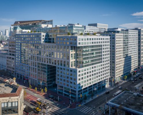 This 640,000-square-foot, LEED Gold certified building includes two levels of below-grade parking, multiple ground-level retail spaces, exterior amenity decks, and office space. It also has an expansive terrace on level 25 overlooking the San Francisco skyline.