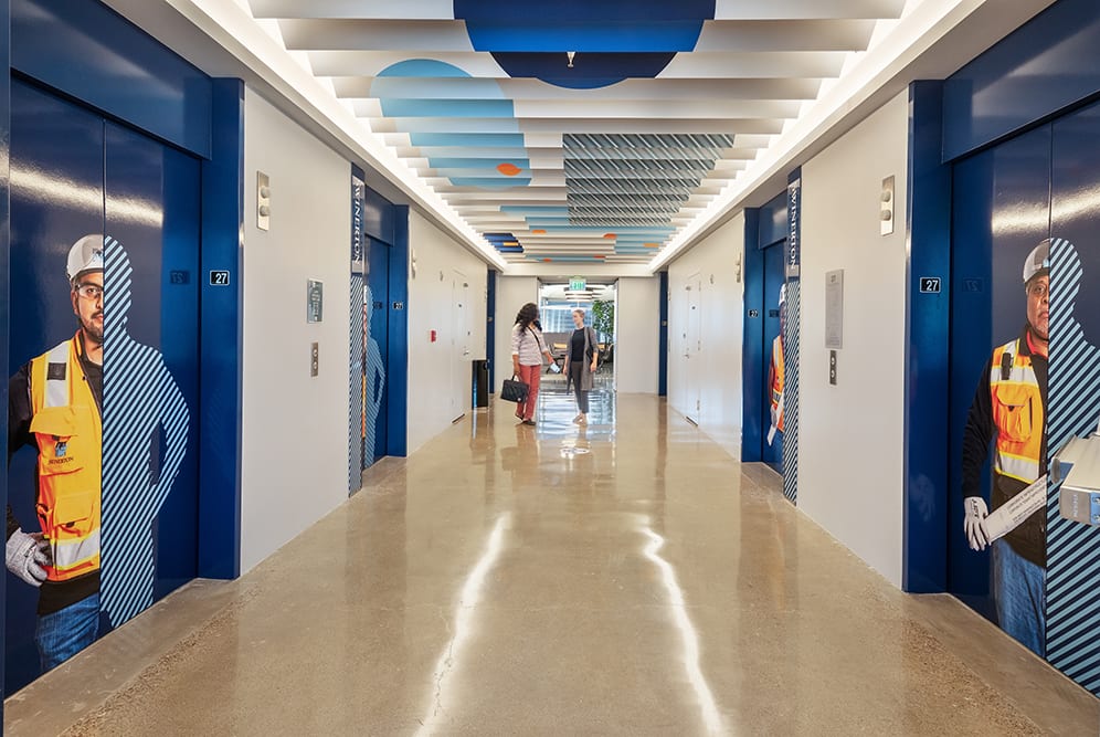 Swinerton’s Downtown Los Angeles elevator lobby has custom wraps featuring employee-owners “earning their stripes.”